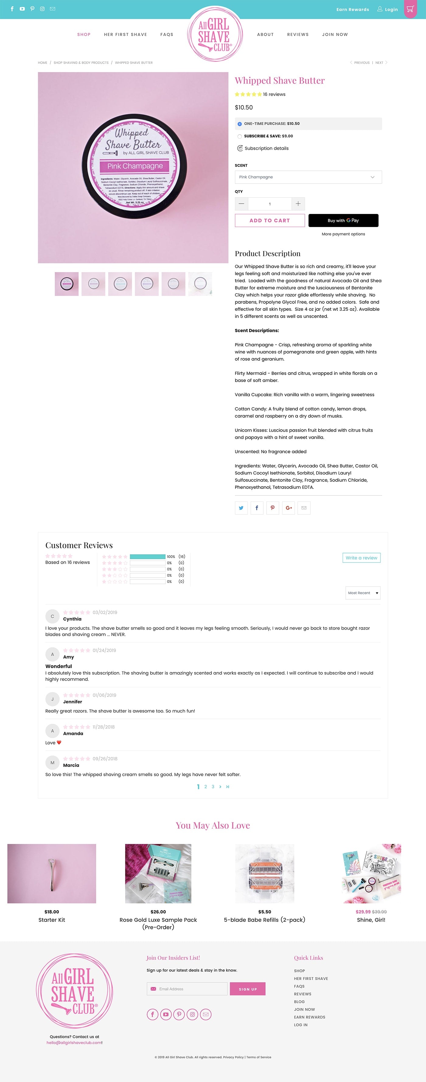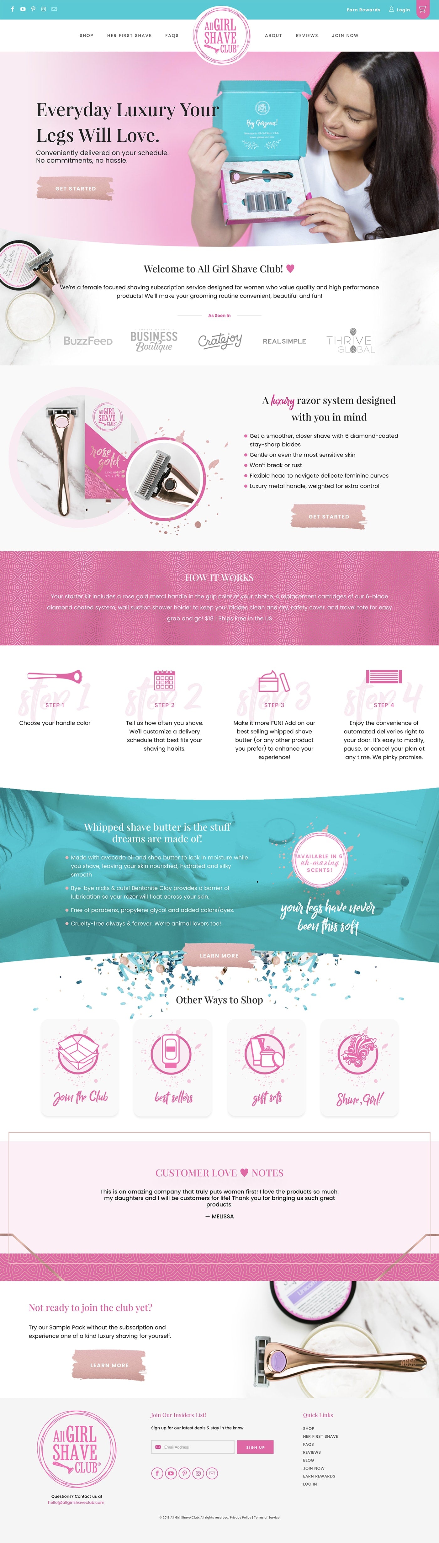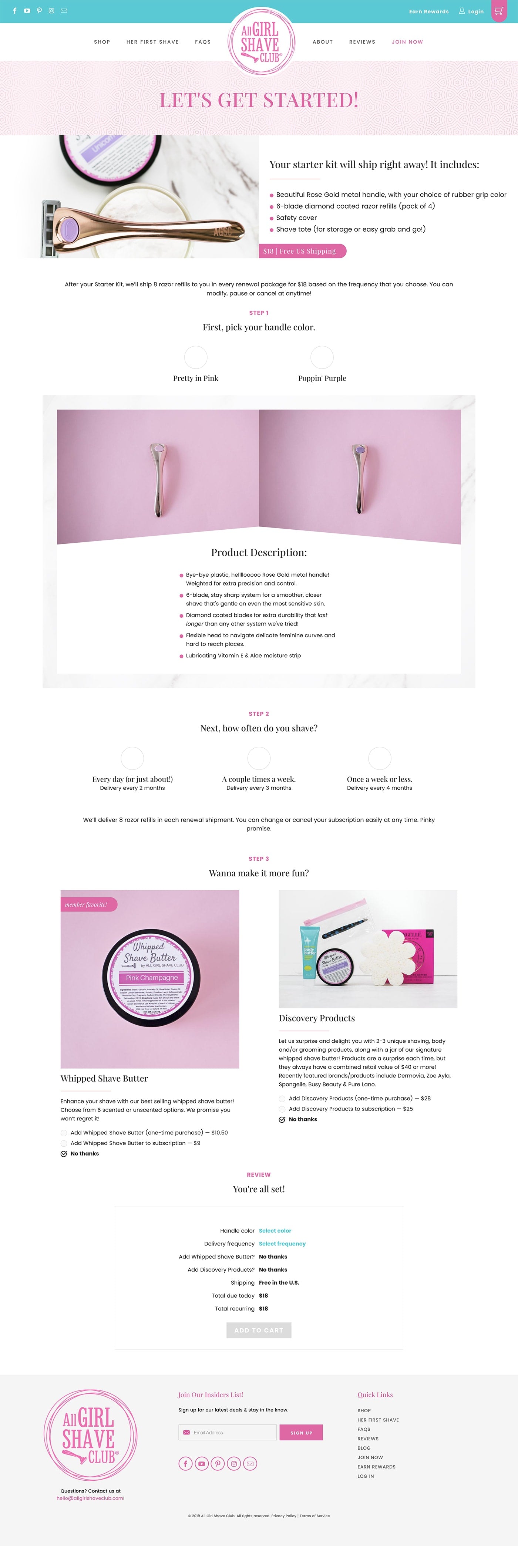 All Girl Shave Club had a unique challenge to solve. They were updating their razor subscription service to a brand new set of products, while also migrating from Cratejoy to ReCharge. This new and improved subscription offering needed an ecommerce home and custom subscription flow to educate the customer, make it easy to select options to customize the subscription service, all while creating an overall seamless customer experience throughout the website.The end result was a beautifully executed, mobile-friendly buying experience whether you're visiting the website to stock up on supplies or sign up for the Starter Kit.